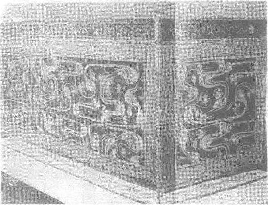 | 释义 | 彩绘黑地漆木棺西汉。长256厘米,宽118厘米,通高114厘米。1972年湖南省长沙市马王堆1号汉墓出土。湖南省博物馆藏。此棺是马王堆1号汉墓四层套棺的第二层。木胎,长方形。内髹朱漆,外在黑漆地上,遍饰色彩斑斓。凸起的云气纹、其作法是用沥粉勾边线,再于线内填朱、白、黄、绿、赭等色漆。云气纹间用堆漆饰以神兽、仙人、鸟、鹤、豹、牛、羊、鹿、马、兔、蛇、鱼等十几种禽兽,组成怪神吞蛇、仙人降豹、仙鹤啄食、怪兽人立、赤豹伏地、巨鸟衔鱼、怪神弹奏、仙人鞠躬、多尾异兽、怪神骑马、豹雀对立等50多种图案。这些神兽怪禽变化多端,形态各异,与云气浑然一体,富有浓厚的浪漫主义色彩,表现了作者丰富的想象力和熟练的技法,是研究当时绘画艺术的重要材料。