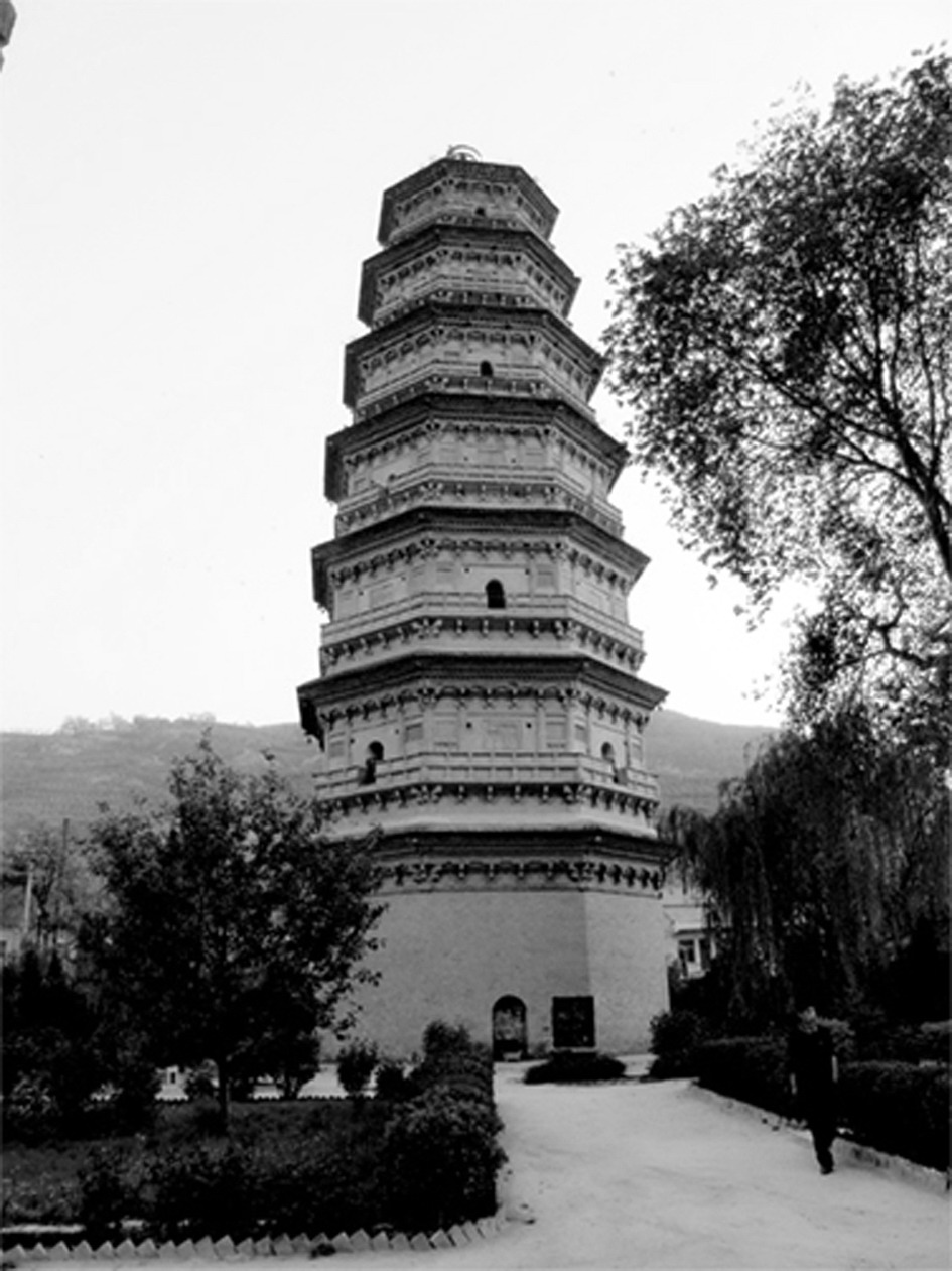 | 释义 | 彬县开元寺塔binxiɑn kɑiyuɑnsi tɑ位于彬县城关镇西街紫微山下的唐开元寺遗址内。八角七层楼阁式砖塔。又称彬县塔。开元寺建于唐神龙元年(705),毁于天宝末年战乱。今已无存。塔通高47.84米,底层边长5.6米。塔身底层南、北辟券门,以上每层辟四券门,隔层位置交错。二层以上每面作仿木结构三间,砌出倚柱、阑额和平座斗拱、钩栏;每层当心间辟门或饰带乳钉的假板门,两侧饰直棂窗。层间叠涩出檐,施菱角牙子和五铺作双抄斗拱;一至四层当心间补间铺作各两朵,五、六层各一朵。塔顶平砖攒尖,置铁质塔刹。塔体内结构为空筒式,各层有木楼梯。1985年4月修葺时,在塔刹周围发现铜佛像、佛座、铜镜、新莽货币、宋代铁钱等遗物;塔刹莲花座上还铸有“大宋皇祐五年(1053)岁次癸巳秋八月十四建成铨记”19字塔铭。1983年~1987年,陕西省文物局拨专款对寺塔的塔檐、斗拱、平座栏杆、塔体裂缝等进行了加固和维修,并恢复了塔内的木楼梯。1956年公布为陕西省重点文物保护单位。