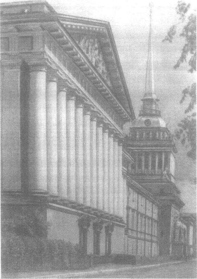 | 释义 | 彼得堡海军部大楼俄罗斯古典主义建筑风格的代表作,建于1806年—1823年,位于彼得堡市中心的涅瓦河岸,东邻冬宫,西接元老院广场,南面正对市中心最主要的街道——涅瓦大街。立面长407m,侧边长163m。朝向大街布置了大门厅、首脑会议厅、办事厅、图书馆等。面河一面,布置了生产车间、放样车间、舰船设计室、仓库等。为克服建筑狭长立面的单调感,在立面的两端做了二组古典主义建筑典型的中轴对称的五段式划分。中段为12根柱子的柱廊,两个尽端为6根柱子的柱廊,用简洁的墙面同中央塔楼联系起来塔楼是整个建筑构图的中心,塔楼基座为有券形门洞的高大的正方体,上有一圈爱奥尼式柱廊及立方形抹角的墩座和穹顶,穹顶上的八角形亭子托着高23m的八角形塔尖,尖顶托着一艘扬帆的战舰,中央塔楼全高73m,体积稳重而轻盈,它的细部处理由粗放而细密,逐层缩小,充满动感和稳定感,成为统率整个立面的中心,整体建筑的立面长而不板,比例协调,富于节奏感。设计者是俄国建筑师萨哈罗夫(1761—1811)。