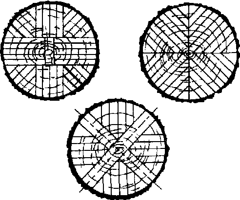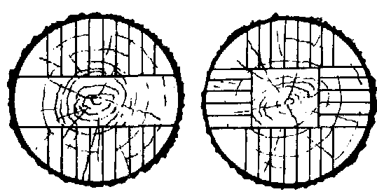 | 释义 | 径向下锯法quarter sawing锯口沿着或接近沿着原木年轮直径方向的下锯法。采用这种下锯法锯割的板材,从端面看,年轮走向与材面垂直或接近垂直,二者夹角大于60。(要求不严时,夹角也可缩小到45°),称为径切材。材面木纹平行,间隔较均匀,干燥时材宽方向收缩小,不易变形,强度较大,共振性好,利用价值较高。乐器、航空、仪器、体育用具及其他一些贵重用材多采用径切材。按对径切材质量要求严格程度、需要量大小,或原材料充足与否可采用完全径切材下锯法(图1),但此法费工费时,特别对大三角形毛料锯割比较费事和不安全,出材率低,所以实际生产中采用不多。带制径切材下锯法(图2),是和其他材种互相搭配锯割的一种下锯法。虽然从每根原木获得的径切材较完全径切材下锯法为少,但综合出材率较高,质量也比较有保证。