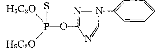 | 释义 | 三唑硫磷triazophos有机磷广谱杀虫剂。化学名称:O,O-二乙基-O-(1-苯基-1,2,4-三唑-3-基)硫逐磷酸酯。化学结构式如下。纯品为淡棕黄色液体,熔点0~5℃,30℃时蒸气压386.6 × 10-6 Pa。20℃时溶于水35±5mg/kg,溶于正己烷0.9%,甲苯和乙醇>38%,丙酮>100%。在中性介质中稳定。对害虫具有强触杀和胃毒作用,并有一定的杀线虫作用。无内吸作用,但能渗透植物组织。可用于棉花、水稻、蔬菜、玉米、大豆、烟草、果树等作物上的刺吸口器、咀嚼口器害虫及钻蛀性害虫。对人、畜有中等毒性,大鼠急性口服LD50为82 mg/kg,急性经皮LD50为1100 mg/kg。对鱼有毒,LC50(96h)为5.6 mg/L。