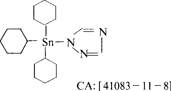 性能 纯品为无色结晶,熔点218.8℃,原粉为白色粉末,有效成分含量不低于90%,25℃时蒸气压小于5×10-3帕,在酸性介质中不稳定,能被水解,失去三唑基。难溶于水,在二氯甲烷、异丙醇等有机溶剂中的溶解度均小于1克/千克。在合适的条件下贮存,可保存两年以上。对高等动物毒性中等,原药对大鼠急性经口LD50为76~180毫克/千克,对雄性大鼠急性经皮LD50为1000毫克/千克。在试验剂量内对试验动物未发现致畸、致突变和致癌作用。对人体每日允许摄入量(ADI)为0.003毫克/千克。对鱼类等水生生物高毒,对鸟类毒性中等,对蜜蜂低毒。杀螨活性较高,主要起触杀作用,无内吸作用,对若螨、成螨和夏卵有效,对冬卵无效。残效期较长,常用浓度下对作物安全,对光和雨水有较好的稳定性。 应用 加工成可湿性粉剂使用。用于果树、棉花、蔬菜等作物,防治柑桔叶螨、柑桔瘿螨、苹果叶螨、葡萄叶螨、棉叶螨、茄子叶螨等。喷雾要均匀。可与其他类型杀螨剂轮换使用,以延缓抗药性的产生。(余昌申) 三唑锡azocyclotin又称倍乐霸。有机锡类广谱杀螨剂。化学名称:1-(三环己基甲锡烷基)-1氢-1,2,4-三氮杂茂。化学结构式如下。原药为无色粉末,熔点218.8℃,20℃时蒸气压小于499.96×10-5 Pa。不溶于水,难溶于其他有机溶剂。对光和雨水有较好的稳定性,在稀酸中不稳定。可杀灭若螨、成螨和夏卵,对冬卵无效,残效期可达30天以上,对敏感性的和具有抗药性的螨类均有很好的防治效果。其毒理机制可能与抑制神经细胞的氧化磷酸化过程有关。可以防治柑橘叶螨、瘿螨,苹果叶螨、葡萄叶螨、茄子叶螨。中等毒性,大鼠急性口服LD50为76~180 mg/kg,急性经皮LD50为1000 mg/kg。对鱼类高毒,对鸟类有中等毒,对蜜蜂毒性极低。