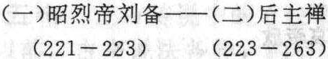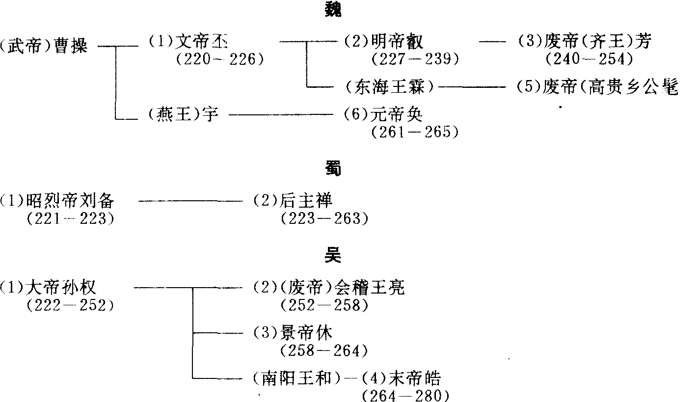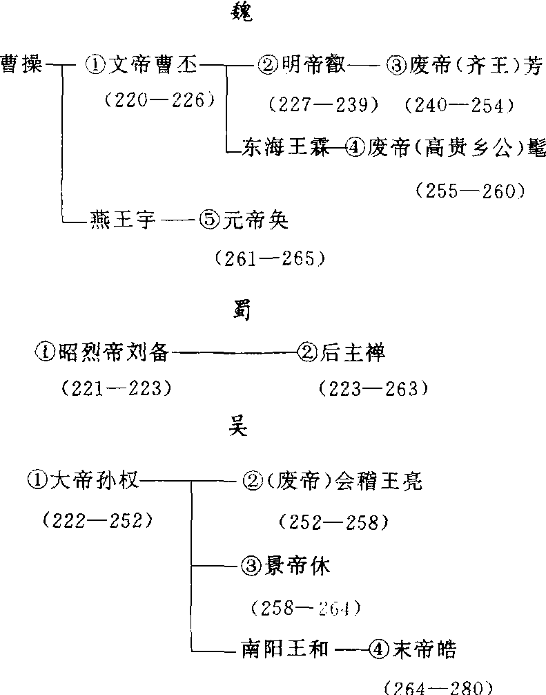 三国220-265Sanguo东汉王朝灭亡后, 出现的魏、蜀、吴三个政权分裂割据的时代,亦指魏、蜀、吴三国。东汉末年的地方割据势力,经过近20年的混战兼并, 在赤壁之战后, 最终形成了曹操、孙权和刘备鼎足三分的局面。延康元年 (220), 曹操死后, 子曹丕称帝,国号魏,都洛阳。次年,刘备也在蜀称帝,国号汉,史称蜀汉,都成都。8年后,孙权在江东称帝,国号吴, 都建业 (今南京)。 三国帝系表