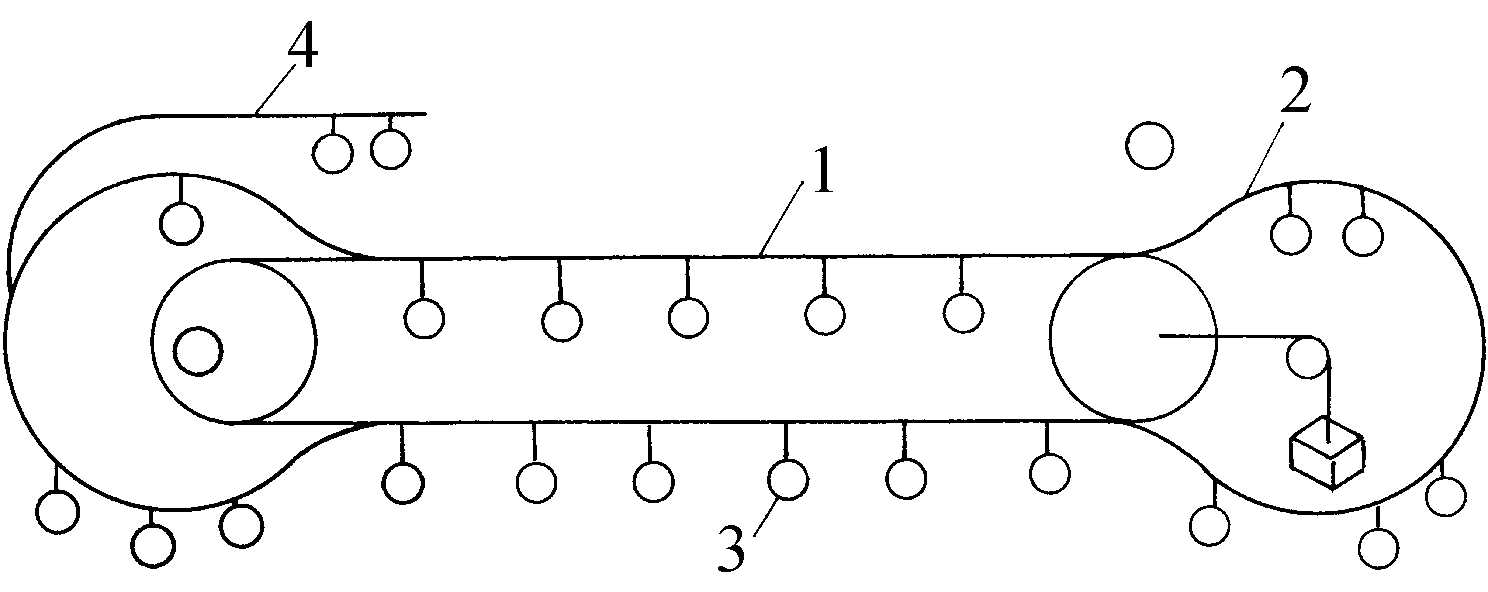 循环式索道示意图1-运载索;2-站内固定轨道;3-吊厢;4-车库
