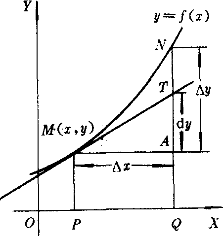 设MT为曲线y=f (x)在点M (x,y)处的切线 (见下图)。当自变量x有一改变量 Δx=PQ时,相应地,函数y得到改变量 △y=f(x+△x)-f(x)=AN. 函数的微分 dy =f′(x)△x =AT 为切线的纵坐标的对应改变量.当△x→0时,△y-dy=TN也趋于零,且为△x的高阶无穷小量,因而在x的充分小的邻域内,可用dy=AT近似地代替△y=AN. |