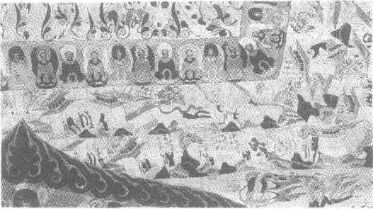 | 释义 | 微妙比丘尼缘品壁画北周。纵40厘米。横560厘米。甘肃省敦煌县莫高窟第296窟窟顶西披北侧壁画。此画取材于《贤愚经》中的一个故事,主要情节是一位名叫微妙的老尼姑向新来的尼姑诉说了自己的身世。出身高贵的她嫁给了门户相当的男子,当她怀第二子时全家回其娘家生产,微妙在归家途中早产生子,其夫却被大蟒咬死,她在含悲赶路时遇一条大河,大儿子被水冲走,提前送到对岸的婴儿被狼啖食。此时,一老者告诉她,其父母被火烧死,她只好留宿于老者家,后嫁给邻居一男子,分娩时其夫酒醉归来,熟煮婴儿,逼微妙共食,她被迫而出走。后在墓园中遇一男子在悼念亡妻而哭泣,同病相怜的二人又结为夫妻。七天后丈夫暴病而卒,微妙被殉葬,贼人盗墓时将其救出,并与之结婚。贼首被判罪处死后微妙再次殉葬,豺狼扒坟时她死里逃生。微妙向佛请教为何自己遭受如此多的苦难。佛告之:你前生以钉子谋害“小妇”之子,并矢口否认,故犯下杀生和妄言之罪,因遭今世之报应。全画构图分上下两层,故事情节作“W”状上下铺叙。此图底色以白粉绘制,赭红色勾描底稿,色彩淡雅。虽年代久远,但人物、景物的轮廓仍十分清晰。人物着汉装,面部采用中原式晕染。山水和屋宇装饰性较强。整个故事情节的描绘生动而有序。