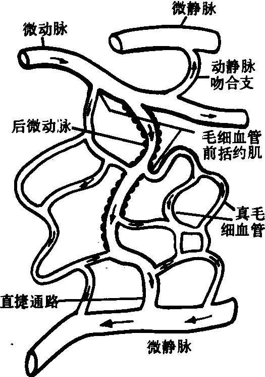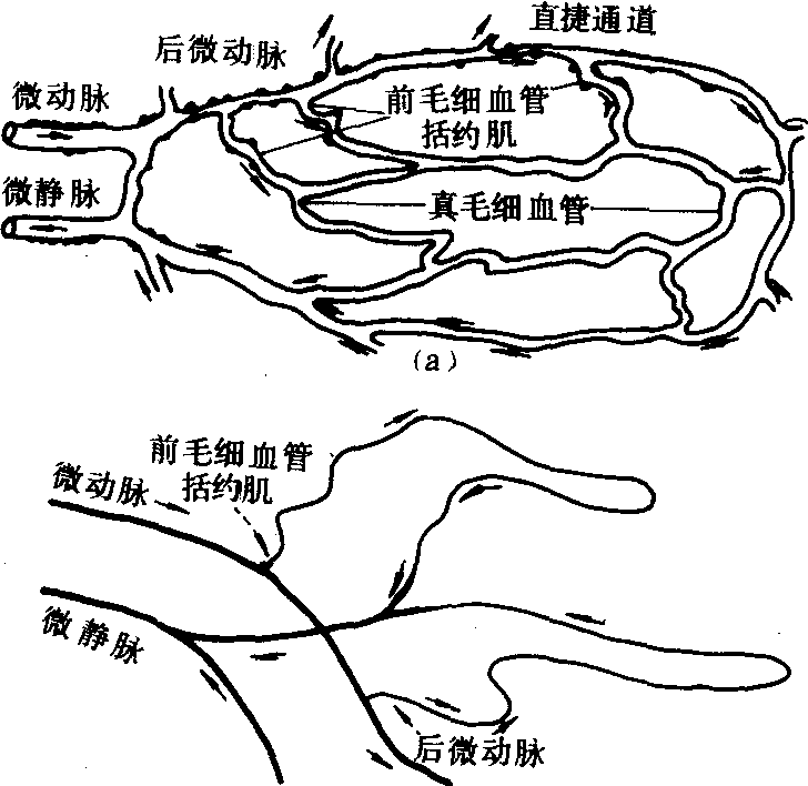 图1—13 微循环的不同图形 a.骨骼肌微循环 b.人的指甲床微循环 微循环microcirculation器官组织中,微动脉和微静脉之间的血液循环。血液和组织之间进行物质交换的地方。一般由微动脉、后微动脉、毛细血管前括约肌、真毛细血管、通血毛细血管(或称直捷通路)、动静脉吻合枝和微静脉等部分组成。机体安静时流经微循环的大部分血液的通向是从微动脉经后微动脉、通血毛细血管直接流向微静脉;小部分血液则从微动脉、后微动脉、经毛细血管前括约肌流入真毛细血管(进行物质交换),再流向微静脉。 |
