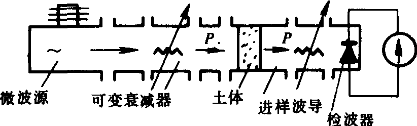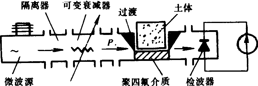 图2 空间波微波土壤湿度仪原理 空间波微波土壤湿度仪 微波发生器发射的微波,用可变衰减器调节到某恒定的输出功率。由于进样器中未放入土样,故可由电表指示到某一固定示度来表示。当进样器中放入被测土样后,微波能量被衰减,电表示度变小,可调节补偿衰减器使能量损耗得到补偿,使电表回复到原有固定示度。从补偿衰减器测得损耗值,在事先标定的关系曲线上即可求得土样的含水量(原理示意见图2)。
