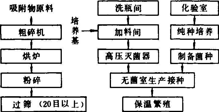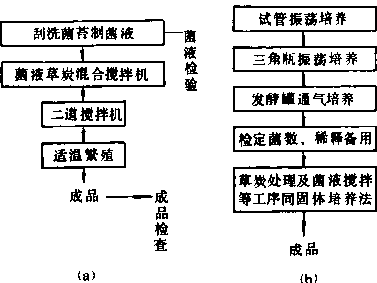 图1 吸附物和培养基的制作 固体培制法 将种菌移到固体培养基的表面,经过保温培养,至培养基表面长出丰满的菌苔后,将其刮洗并拌入吸附剂,再经培养繁殖成母(菌)剂。该法的生产工序除在大量培养基中添加一定量的凝固剂以及培养成功后的刮洗菌苔等操作以外,完全与液体培制法相同。菌肥培制工序示意如图2。