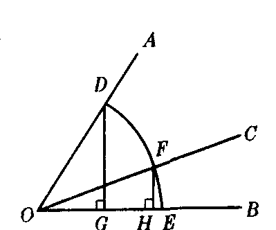关于三等分已知角问题.如图,设OC是∠AOB的三等分线,以O为圆心,r为半径作弧和OA,OB,OC分别交于D,E,F,作DG⊥OB于G,FH⊥OB于H.设OG=a,OH=x,∠AOB=a,则cosa= ![]()