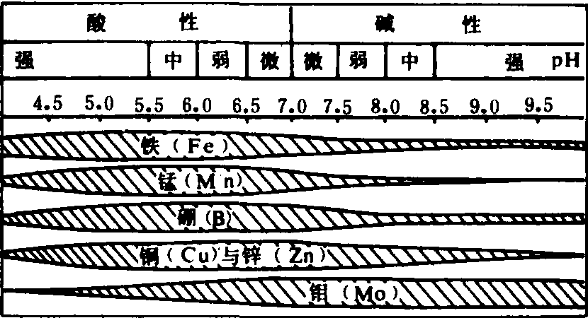 土壤中微量元素的有效性与pH值的关系 施肥情况 肥料种类和施肥水平与作物吸收利用微量元素有密切关系,如锌肥与磷肥有颉颃作用,大量施用磷肥会导致作物发生缺锌现象;但磷与钼之间有促进作用,如磷肥与钼肥配合施用,其肥效大于两者单独施用的效果;硫肥加重钼的缺乏。在高氮条件下,钾促进硼的吸收,而在低氮条件下,钾抑制硼的吸收。微肥施用效果多数与氮、磷、钾肥施用水平有关,施用水平愈高,则作物需要更多的微量元素来维持体内养分的平衡。因此,在施用微肥时,不仅要在微量元素供应不足的低产土壤上施用,而且在施用高量氮、磷、钾肥料的高产土壤上,适量补充微肥以协调营养,进一步提高肥效和产量。 气候条件 气候干、湿、寒、暖直接影响微量元素的溶解度和作物根系对微量元素的吸收强度,如在多雨条件下,微量元素易淋溶流失;在少雨干燥条件下,微量元素不易溶解,作物吸收性差,一般在极端的气候条件下都易引起微量元素的缺乏,施用微肥就会有增产效应。 营养诊断 见营养诊断。 施肥方法 可作基肥、追肥和种肥,包括土施、根外追肥、种子处理和蘸根等。由于作物需要微量元素的量极少,元素的缺乏、适量和过量之间的浓度范围狭窄,因此,施用微肥通常以根外追肥和种子处理为主。施用时必须严格掌握适量、适时和施用均匀的原则。为保证施肥的均匀性,通常将少量的微肥先溶解成水溶液后施用,或者与其他肥料混合均匀后施用,或者直接将微量元素与常量元素肥料制成复混肥后施用。作根外追肥的溶液浓度依作物种类、年龄、生长环境等而异。常用的浓度范围为0.01%~0.5%,用量一般以喷洒叶片正反两面均湿润为度。种子处理包括浸种和拌种,亦将微肥配制成需要的浓度后,让种子浸入溶液中,使种子吸收溶液而膨胀并将微肥养分随溶液而进入种子内;或将配好的溶液喷洒到种子上,使种皮沾附一层微肥溶液,阴干后播种。浸种的溶液浓度一般为0.01%~0.05%,浸种时间因作物和微肥种类的不同而异。拌种的常用量为每千克种子用2~6克微肥。蘸根也是将微肥配成一定浓度的溶液后,将作物的根系浸入溶液内片刻后栽种。蘸根一般适用于水稻和在需要移栽的作物上施用。为提高微肥对作物的有效性,有些微肥的施用还采用注射法,涂叶、涂茎、根际埋瓶和飞机喷施等方法。此外,根据植物矿质营养遗传差异机理,选育对某种微量元素利用效能高的品种,也是微肥施用方法改进的另一重要途径。 微量元素肥料简称“微肥”。含有一种或多种微量营养元素的肥料。多作种肥和叶面喷肥用。