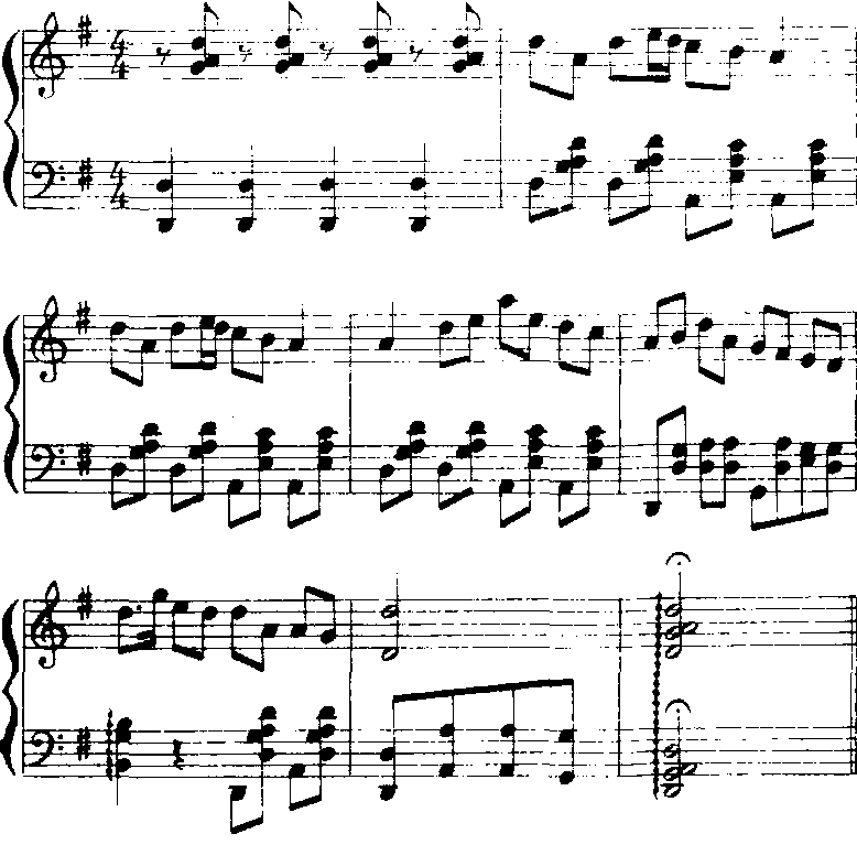 | 释义 | 徵调式歌曲和声配置Zhidiaoshi gequ heshengpeizhi徵调式在五声性调式中也是一个重要的调式,它和宫调式一样,均属于大调性范畴。徵调式的主音是徵 (sol),其上、下五度骨干音分别是商(re)和宫(do),其主和弦的三音变宫 (si)是偏音,常用宫音来代替变宫音。属和弦中的三音是偏音清角(fa),但由于其处在三音位置,已被淡化,所以这和弦常被直接采用,也可用徵音代替清角音。(上面举例的用宫音代替变宫音的徵调式主和弦及用徵音代替清角音的徵调式属和弦这二个和弦,因其音响结构上和琵琶空弦扫弦时的音响结构相同,故称为琵琶和弦。)徵调式的下属和弦均由正音构成,可直接采用。徵调式的Ⅱ级音及Ⅵ级音上所构成的和弦均可用。徵调式和声配置举例: 歌剧 《白毛女》 中 《扎红头绳》 片断:
