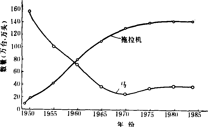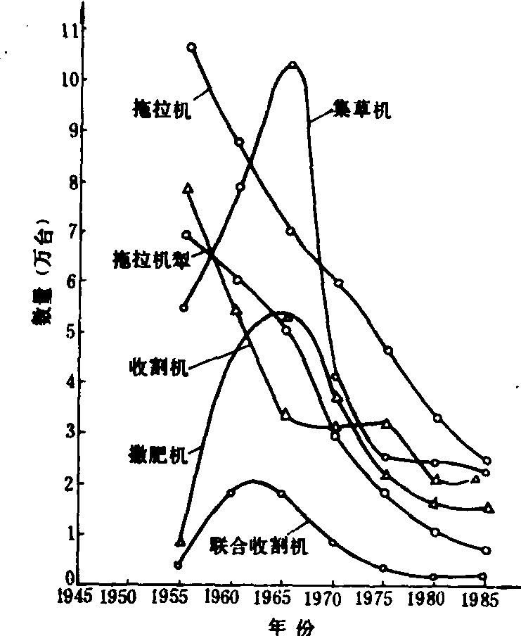 图1 西部地区拖拉机和耕畜数量的变化情况 农机工业 第二次世界大战结束后,农机工业的主要任务是满足国内需求。1970年前后,出口部分开始直线上升。1985年,拖拉机和农机具总销售额达到80°亿马克,其中出口部分50亿马克,占62.5%。但同期一些农机具在国内的销售量却显著下降。如拖拉机的国内销售量由1955年的10万多台下降为1985年的约2.5万台(图2)。