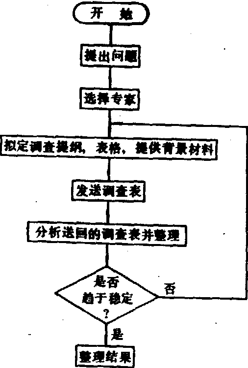 ❶将预测专家按编号填入表中,将0~1之间的概率划分为9个等级,表明人均收入增长可能出现的9种情况。取误差为±1%,排除0(不可能)和1(有100%的把握)两种情况,则预测的累积概率是从1%~99%; ❷将每位专家的预测结果按前述9个等级填入汇总表。例如,第1号专家预测人均收入增长的波动幅度为4%~6%, 将其按9个等差组填为4%, 4.25%,4.50%……6%,表示人均收入增长至少达到6%的概率为1%;至少达到4%的概率为99%; ❸求出每组概率的中值,代表该组可能增长率的预测结果; ❹根据汇总表进行分析,做出预测结论。本例的结论为人均收入增长率最低可能为5.3%,最高可能为8.2%。取累积概率为50%时的中值6.8%为人均收入增长率的预测值。 德尔菲法国外一种决策者向专家几轮函询预测结果而作出决策的方法。做法是:就某一问题,在收到有关专家的回信后,将他们的意见分类统计,综合归纳,再不带任何倾向地把结果反馈给各个专家,供他们进一步分析判断,提出新的估计。如此多次反复,意见渐趋接近,最后得到一个较好的预测结果,为决策者提供依据。此法为国外决策者经常采用。 德尔菲法Delphi technique按规定的程序,以匿名反馈的方式,征询专家对预测问题的意见,然后进行综合的一种定性预测的方法。20世纪40年代由赫尔姆(O.Hearlm)和达尔克(N.Dalke)首创,经戈尔登(T.J.Gelden)和兰德公司进一步发展而成。借希腊神话中能预见未来的圣地“德尔菲”命名。具体做法是先邀请部分专家,将所要预测的问题和有关的资料寄给他们,征求意见。然后把专家意见集中整理,再匿名反馈给各个专家,再次征求意见,这样经过几次反复(一般三至四轮),意见逐渐趋于一致,得出预测结果。这种方法的特点是: |