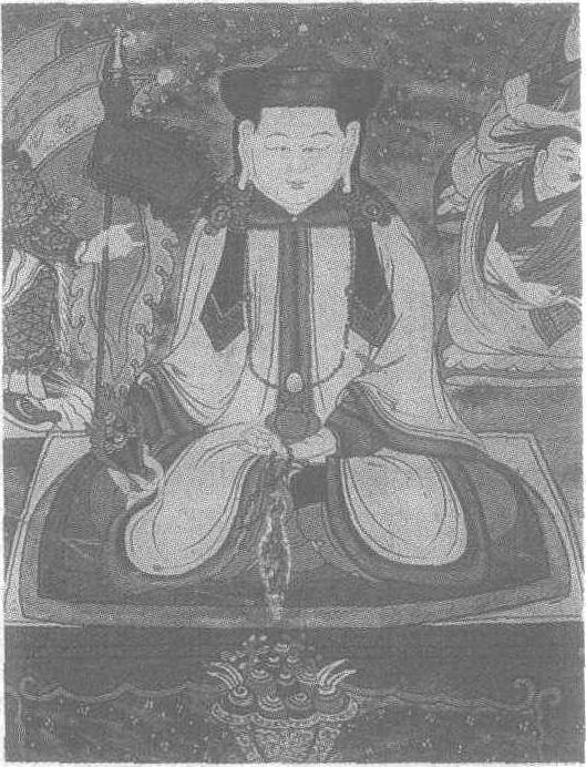 | 释义 | 三娘子礼佛生活图壁画清。坐高120厘米。内蒙古自治区土默特右旗美岱召大雄宝殿西壁下部壁画。三娘子是明代右翼土默特部首领俺答汗之庶妻,明隆庆五年(公元1571年)协助俺答汗与明朝建立通贡互市关系。明万历六年(公元1578年)与俺答汗同赴青海谒见达赖三世,使喇嘛教黄派传入蒙古地区。俺答汗卒后,三娘子主持政务达30年之久,一直保持着同明朝中央政权的友好关系,对蒙、汉族民族之间的友好有着特殊贡献。图中三娘子为其老年形象,头戴皮沿帽,发辫垂肩,身穿对襟皮衣,胸戴一串念珠,一手持本巴瓶和小串念珠,另一手持一件法器,盘腿坐于木几之上。面容慈祥,隐含笑容,老年人的皮肤松弛及皱纹被生动地表现出来。此图设色鲜艳,笔触苍劲而有力,具有蒙古族地方特色,是研究蒙古族风俗的宝贵资料。