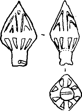 | 释义 | 心形镂孔铜饰 青铜时代装饰物。1979年在吉林省吉林市郊区江北乡猴石山第18号石棺墓出土。现藏吉林省考古研究所。青铜,范铸。中空,镂孔,心形,作矛头状。筩断面呈椭圆形,尾端有一方孔,用以固定木柄,筩内上部颈处有一弓形细丝,以防木柄捅进心形腔内,“矛头”断面为菱形,上部有人字形镂孔四个,下部有三角形镂孔八个,近尖部有三角形镂孔二个。通长9.8、“矛头”长7.4、筩长2.4、“矛头”宽5.6、筩径2、壁厚4. 4厘米。此器在西团山文化青铜器中是首次发现,似属旗杆头上的装饰物。