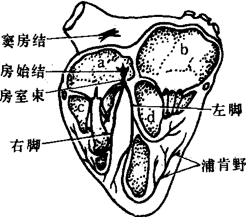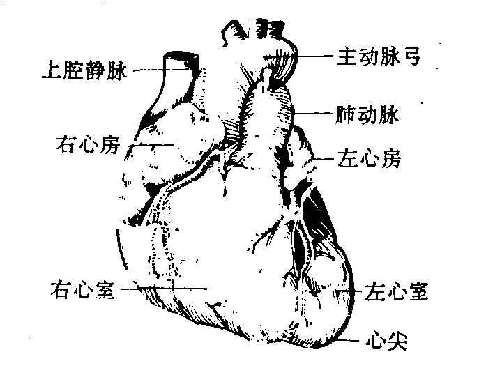传导系 由特殊的心肌纤维构成,能自发产生和传导兴奋,维持正常心搏动的节律性。包括窦房结、房室结、房室束和浦肯野纤维。窦房结是心跳的起搏点,位于前腔静脉和右心耳间的界沟内,由薄而分支的结细胞网构成,被富有含血管的结缔组织隔开,内含许多交感和副交感神经纤维及神经节细胞,它们与心房的普通心肌纤维相连。房室结位于右心房冠状窦口附近,在房间隔的心内膜下,由排列不规则的小分支结细胞构成,与心房肌纤维及房室束的浦肯野纤维相连续。房室束沿室间隔膜部向下,分为左、右两脚,沿室间隔两侧的心内膜向下延伸,并通过隔缘肉柱(节制索)至乳头肌根部分散为浦肯野纤维,彼此交织成网分布于心室壁与普通心肌相接;左脚还分出隔支至室间隔。房室束、左右脚和浦肯野纤维有一薄层纤维鞘包裹,有蹄类此鞘较发达。传导系的疾患可导致心室的搏动失调或心房和心室的收缩节律紊乱。 心脏xinzang血液循环的动力器官。心脏(图1、2) 位于胸腔内,膈肌上方,两肺之间,前面是胸骨和肋骨,后面是食道和脊柱。它的大小似本人的拳头,形状似桃子,尖向下端偏左称心尖,底朝上偏右称心底。心底部有动静脉出入,活动度小,心尖不受牵连,活动度大。心脏(图3)为一中空的肌性器官,由中膈分为不相通的左右两半,若有异常通道,就形成某种先天性心脏病。每半侧又横分为上下两个腔,上面较小的叫心房,下面较大的叫心室,心房和心室有房室口相通。在房室口边缘附有瓣膜,这些瓣膜如同阀门,能自动地向心室开放,让血液由心房流入心室而不许返流。当患风湿性心脏病时,心脏瓣膜会发生病变而影响血液循环的正常进行。右心房与上、下腔静脉连通,右心室与肺动脉连通,左心房与肺静脉连通,左心室与主动脉连通。在主动脉和肺动脉的根部腔面,分别有三个袋状的瓣膜,它们也像阀门,防止血液由动脉返回心室。组成心脏的心肌细胞有收缩性,心脏的收缩和舒张则是因为这些心肌细胞工作的结果,好比水泵的一压一放,使血液不断由心脏排入动脉,又不断从静脉回到心脏。有些心肌细胞失去原有的收缩性特化成心脏的特殊传导系,包括窦房结、结间束、房室交界区、房室束及浦肯野氏纤维。窦房结可以发布心跳的 “命令”,沿特殊传导系传到整个心脏,心脏则按“命令”跳动。心脏本身的氧气和氧料由冠状动脉供应,一旦冠状动脉因病变梗塞,心肌血液供应减少,可以引起心肌梗塞,心绞痛等疾病。