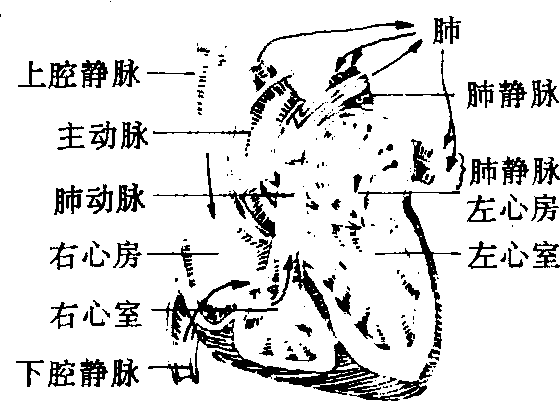 图3 心脏内部的构造 心脏Xinzang位于胸腔正中偏左,两肺之间,主要由心肌组织构成,并有瓣膜结构的中空器官。含有两心房、两心室四个腔。左、右心房和左、右心室之间有中膈,彼此互不相通。每侧心房、心室之间有瓣膜,称为房室瓣。其中左房室瓣又叫二尖瓣,左房室瓣又叫三尖瓣。心脏各腔分别与血管相连:左心房与肺静脉;右心房与上、下腔静脉;左心室与主动脉;右心室与肺动脉;心室与动脉之间有半月瓣。心脏瓣膜的作用是使血液按一定方向流动,不能倒流。即心脏内血液只能从静脉流入心房,再从心房到心室,从心室流入动脉。