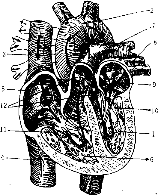 1.左心房 2.主动脉弓 3.上腔静脉4.下腔静脉 5.右心房 6.右心室7.肺动脉 8.肺静脉 9.左心房10.二尖瓣 11.三尖瓣 12.半月瓣 心脏结构及周围血管(箭头表示血流方向) 左房室内是来自肺部含氧多的血液,称动脉血;右房室内是含氧低的静脉血。中膈使动、静脉血不相混合,还使心脏泵出的血液分为两部分:一部分参与肺循环,另一部分参与体循环。某些先天性心脏病,是由于中膈愈合不全造成的。心脏自身的营养由冠状动脉提供,它由主动脉根部发出,产生病变(如痉挛或形成血栓)可引起心脏局部供血不足,造成心绞病,严重时发生心肌梗塞,甚至死亡。心肌与骨骼肌不同,具有自动节律性,但并非所有的心肌细胞都具有自动节律性。心脏有节律地收缩和舒张,决定于心脏的特殊传导系统,是由一些特化的心肌细胞构成,包括窦房结,房室结,房室束及其分支,浦肯野氏纤维等。其中窦房结的兴奋性最高,成为心脏的起搏点。正常成人安静时心率为60—80次/分,也叫窦性心率。超过100次/分,为心率过速;低于60次/分为心率过缓。如果心脏传导系统出现异常,将引起心率不齐。