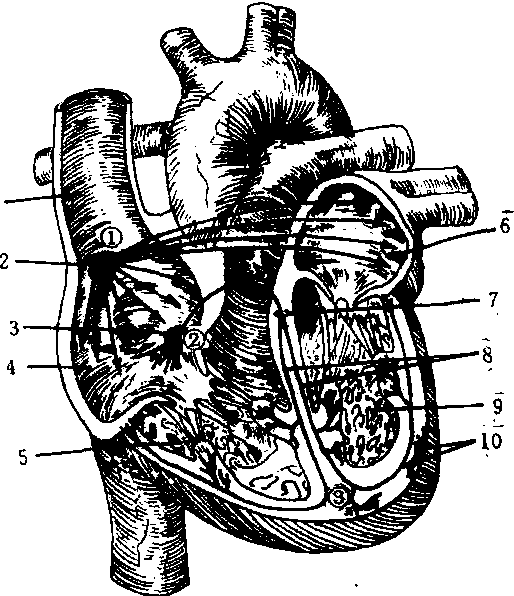 1.上腔静脉 2.窦房结 3.房室结4.右心房 5.右心室 6.左心房7.房室束 8.房室束左、右分支9.左心室 10.浦肯野氏纤维 心脏的特殊传导系统(1 2 3表示传导顺序) 心音主要是由心脏瓣膜关闭时发生振动形成的,心脏进行一次收缩和舒张过程中,可以听到两个心音。即第一心音和第二心音,它们分别由房室瓣和半月瓣关闭造成。当心瓣膜异常时(如充血、肿胀),常可听到正常心音之外有杂音。心电图是在人体体表记录到的心脏生物电变化,它是检查心脏机能状态的一个指标。心音和心电图在临床诊断中,具有一定参考价值。 心脏推动血液循环的肌性器官。位于胸腔内,在左右两肺之间,周围有心包。内有两个心房,中间为房间隔,两个心室,中间为室间隔。左房室口有二尖瓣,右房室口有三尖瓣,使血液呈单向流动。由于心肌节律性收缩,使静脉血从右心房进入右心室,通过肺进行气体交换以后变成动脉血,进入左心房再到左心室,然后运送到机体各部的动脉血管。 |