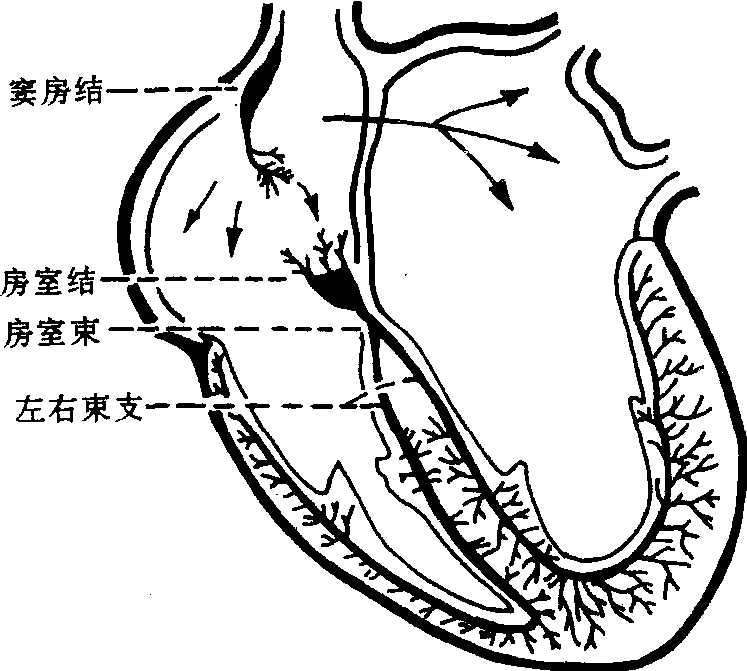 | 释义 | 心脏各部分活动配合协调的原因为什么心脏各部分的活动有一定的顺序和时间间隔、互相配合得那么有条不紊?这是由心脏特殊传导系统不同部分的传导特性不同而保证的。窦房结发出的兴奋在正常情况下主要是通过特殊传导组织传导的。窦房结发生兴奋后首先通过心房肌纤维传导到两侧心房肌,由于心房肌体积小,兴奋几乎同时到达心房各部分,因而两侧心房的肌纤维几乎同时收缩。窦房结的兴奋在沿心房肌纤维传到两侧心房肌时,也沿心房肌纤维传导到房室结,但因房室结处传导速度较慢,兴奋在这里通过时要延搁0.05—0.1秒,保证了心室的兴奋落后于心房,在心房收缩结束之后心室才兴奋继而引起收缩,因而,房室结处的延搁有重要的生理意义。房室结兴奋后依次沿房室束、左、右束支及分支纤维,最后传导到心室肌纤维各部分,由于心室特殊传导组织传导速度极快,尽管心室体积较大、壁层较厚,但两侧心室肌各部分几乎同时兴奋,同时收缩。以后心脏再进行下一个周期的活动。所以我们说,心脏各部分的活动协调是由心脏特殊传导系统的特点决定的。