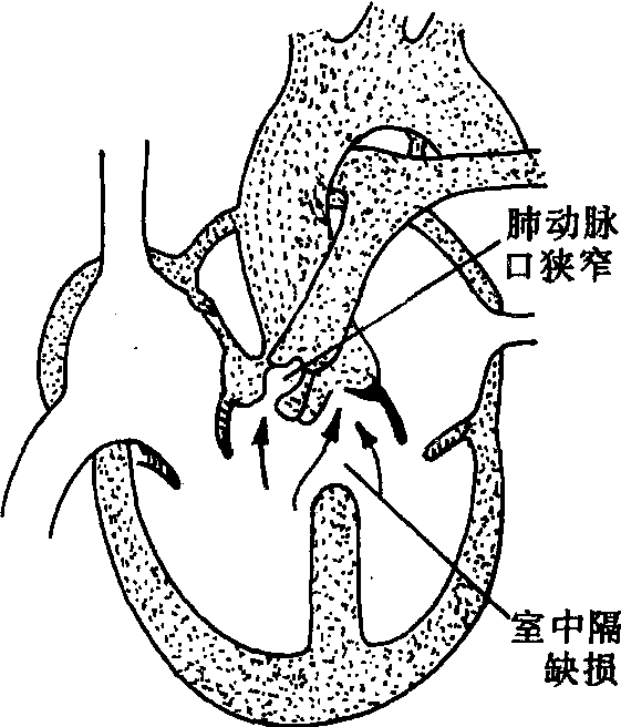 | 释义 | 心脏的发生及畸形心脏发生得很早,功能开始也很早,第23天胚胎的心脏就开始跳动,此时刚发育成很简单的管形构造,称为心管。最早的血球在卵黄囊壁上发生,然后沿血管进入胚体内。第23天胚心脏开始跳动,但这时的跳动是无意义的。到第4周末,心血管系统开始了真正的循环功能。第5周时,心管发生弯曲,逐渐长成成人心脏的外形,但这时心管内部还是一个互通的管道,心房、心室、动脉干都是一个腔,在胚5—8周中完成分隔过程,心房分隔成左右心房,心室分隔成左右心室,动脉干分隔成主动脉与肺动脉。心室分隔过程中,室间隔上缘凹陷,形成一孔,称为室间孔,此孔于第8周封闭。如不封闭,可造成室间孔未闭心脏畸形或称室间隔膜部缺损。如缺损部位较大,患儿可出现缺氧症状。心房分隔过程中形成两个相邻的隔膜,每个隔膜上都有一个孔。第一房间隔在左,第二房间隔在右。第一房间隔上的孔位置高,称房间孔,第二房间隔上的孔低,称卵圆孔。两孔虽不能对通,但右心房的血可从卵圆孔经房间孔流入左心房,而左心房的血却不能倒流。直到出生后,两个房间隔贴合,卵圆孔封闭,左右心房才完成分隔。如房间孔过大或位置低,两孔对通,可造成卵圆孔未闭心脏畸形。卵圆孔未闭可使左右心房互相对通。当两侧压力明显不同时,可发生左向右或右向左的分流,均可造成患儿缺氧。动脉干分隔不均等,隔膜偏于肺动脉侧,可造成肺动脉狭窄畸形,常同时发生4种缺陷,即肺动脉狭窄、室间隔缺损、主动脉骑跨及右心室肥大,也可称为法乐四联症,是先天性心脏病中最重要的一种(见图2.4-10)。患儿表现严重缺氧,脸色青紫,呼吸困难,活动受限等症状。
