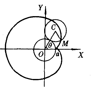 心脏线是蜗线的特例,也是圆外旋轮线的特例:当半径为a的动圆沿着具有相等半径的定圆作无滑动的滚动时,动圆圆周上一点M的轨迹(如图2),它们直角坐标方程是[(a-x)2+y2-2a(a-x)]2=4a2[(a-x)2+y2],故心脏线是4次代数曲线. |