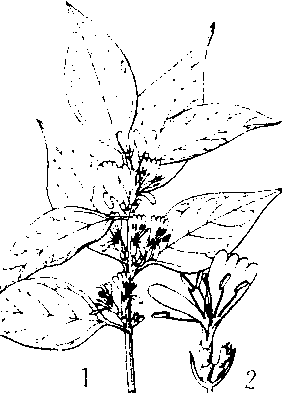 忍冬 1.花枝 2. 花的纵剖面,示雄蕊及雌蕊 |