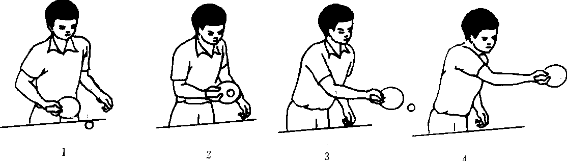 教学重点 ❶徒手模仿练习。强调手指、手腕应使拍面沿球体作弧形运动。 ❷画定落点的记板数练习。掌握击球节奏。 ❸移动中两点推回一点练习。加强手法与步法配合,提高击球准确性。 快推球推挡球技术之一。指直握拍击球员在反手位借对方来球的反弹力,结合本身的推击力量进行还击的球。具有站位近、动作幅度小、球速快的特点。在比赛中运用其速度和落点变化起助攻作用,也可直接得分。推挡和正手攻球结合形成左推右攻打法。站位偏于球台左侧,身体正对球台,两脚平行开立重心置两脚之间。击球前手臂适当后撤引拍,击球时上臂带动前臂迅速向前伸展迎球,拇指稍放松。在来球上升期击球中上部,击球一刹那前臂稍外旋配合手腕外展,食指压拍使拍面前倾沿球体作弧形运动,在向前发力的同时稍微向上辅助用力。击球后手臂迅速放松还原(图2—3—35)。老年人练习时,速度可由慢逐渐加快,待来球从本方球台弹起至上升后期接近高点期时再击球,控制击球的节奏。采用左方斜线为主(或其他基本线路),对推练习,掌握击球时间、拍形角度、击球部位和发力方法。采用有规律的一点推两点和两点推回一点练习,强调手法与步法协调配合。但老年人练习时,移动距离不宜过大。