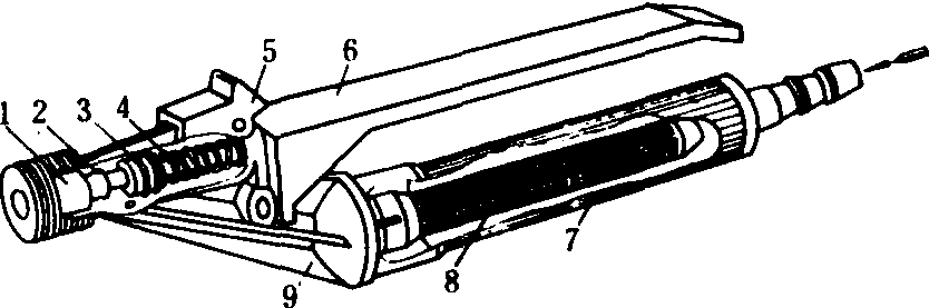 图2 锥形快速截流阀 1.阀座; 2.锥形阀杆; 3.密封圈; 4.弹簧; 5.定位块; 6.扳机; 7.手柄;8.过滤网; 9.阀体 |