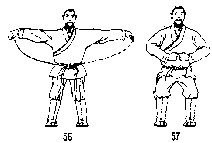 四十九式经络动功第1段“通经”动作之一:❶随着吸气,两腿伸直不动,以两腕顶端领先轻轻向前侧方提起,臂自然伸直,掌高略低于肩;眼平视前方。(图56)❷随着呼气,两腿半蹲;同时两手抱于腹前成一圆形,少商穴和商阳穴相接,仿佛一轮明月抱入胸怀,给人以飘然清爽之感;眼余光看少商和商阳。(图57)要求:意想明月或商阳,精神与肢体高度放松,松腰敛臀。经络动功第1段“通经”动作之八,第2段“循行”动作之十,以及第3段“导气”动作之十七都是重复此动作。