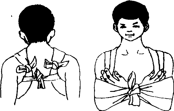 关节脱位的固定 ❶肩关节前脱位。将伤肢时关节屈曲90°,取两条三角巾,其中一条用以悬挂前臂,可直接斜跨胸背部于腱肩上打结;另一条折叠成宽带,绕过患侧上臂,在健侧腋下打结。 ❷肘关节后脱位。用钢丝夹板弯曲至135°左右的角度,置于肘后,用绷带缠绕扎稳后,用悬臂带将伤肢前臂挂起。若无钢丝夹板时,可用普通夹板代替,或直接用三角巾将患肢固定在躯干上。 |