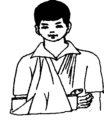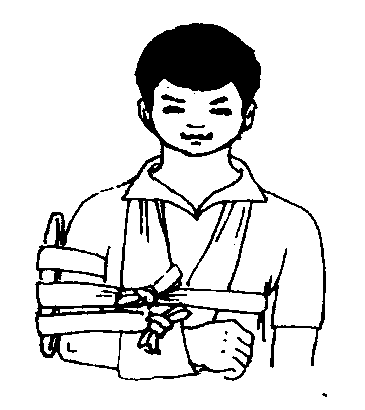 ❷肱骨干骨折。用两块长短、宽狭相当的有垫夹板分别放在伤臂的内、外两侧, 用2条宽带将骨折的上下缚好,屈肘90°,用小悬臂带将前臂挂于胸前,再用绷带