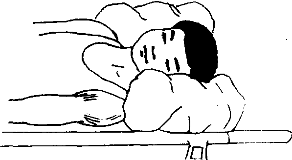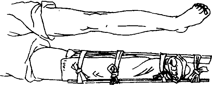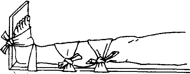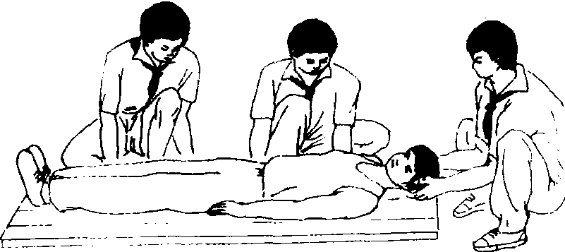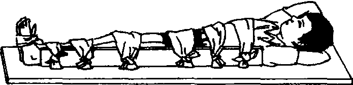 下肢骨折固定 ❶股骨骨折。取三角巾5—8条分别折叠成宽带,再将两块有垫长夹板分别置于伤肢的内、外两侧。外侧的长夹板上达腋下,下至足跟部;内 ![]() 图6股骨骨折的固定方法 ![]() 图7小腿骨折的固定方法 ![]() 图8踝足部骨折的固定方法 侧的夹板上至大腿根部,下达足跟,然后用宽带固定夹板并在外侧打结(图6)。 ❷小腿骨折。取两块有垫夹板分别置于小腿内、外两侧,上至大腿下部,下达足跟部,用三角巾折叠成的宽带或布条分别在膝上、下和踝部缚扎固定(图7)。 ❸踝足部骨折。取一直角形夹板置于小腿后侧,用棉花或软布在踝和小腿下部垫好,再用宽带或三角巾分别在膝下、踝上及脚掌处缚扎固定(图8)。 躯干骨折固定 ❶腰椎骨折。疑有腰椎骨折时,应尽可能避免变动体位,更不要让伤员坐或站起。用硬板担架或门板置于伤员身旁,由数人协力轻轻将伤员搬到木板上,取仰卧位,并用宽布带将其固定在木板上。如腰部悬空时,应在腰下垫一小枕头或衣物。若使用帆布担架患者要俯卧,使脊柱伸直,禁止屈曲(图9)。 ❷颈椎骨折。若固定、搬运方法不当,可发生高位截瘫甚
