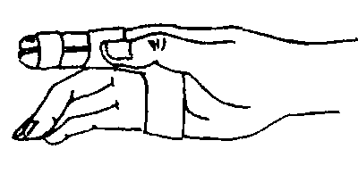 ❸前臂骨折。用两块长短适宜的有垫夹板, 分别放在前臂的背侧和掌侧,固定2道绷带,屈肘90°,拳眼向上,再用大悬臂带将前臂挂于胸前(图3)。 ❹手腕骨折。手握纱布或绷卷,然后用一块有垫夹板放于掌侧,用绷带包扎固定,最后用三角巾将前臂挂在胸前(图4)。 ❺手指骨折。用一块压舌板放于掌侧,再用胶布固定(图5)。
