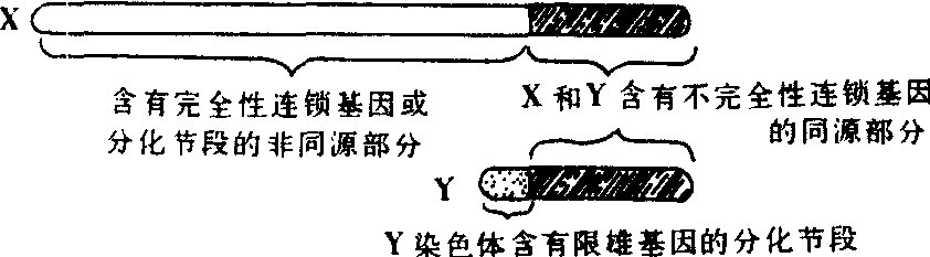 图595 X和Y染色体比较 染色体的两种精子。就性染色体而言,产生两种配子的性别,称为异配性别(这里为雄性);只产生一种配子的性别,称同配性别(这里为雌性)。例如,人类体细胞的46条染色体,可配成23对,其中1对决定性别的染色体在男性为XY,在女性为XX,其余是22对常染色体。X和Y染色体,无论在大小和功能上都不一样,Y染色体只有X染色体大小的1/5,男性就是由Y决定的,X染色体则带有与性别决定无关的其它许多基因。基本的性染色体系统(参见“性别决定”条)有两个:XX( )XY()和ZW( )ZZ()。性染色体见“细胞”中的“性染色体”。 性染色体与性别决定直接有关的,在异配性别生物中形态不同的一对同源染色体。如人体细胞中的X染色体和Y染色体。 性染色体sexchromosome雌雄异体动物和某些高等植物中,与性别决定直接有关的一对染色体。或因性别不同,在形态结构和组成上有差异的一对染色体。基本分两大类: |