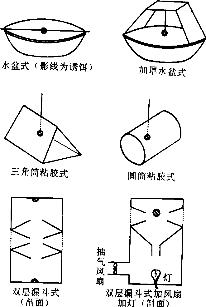 性诱器 性诱器有多种形式,可根据不同种类的昆虫、不同应用目的、不同设置场所等,设计各种性诱器(见图): ❶水盆式:用水盆盛水,水中放少量洗衣粉以降低水的表面张力,将水盆放在田间适当地方,再将性诱物质或活虫分别装在诱器内,悬挂在水盆上距水面2厘米左右处,可引诱同种异性昆虫跌落水面。此种装置需防雨防晒,最好在盆上加覆盖物。