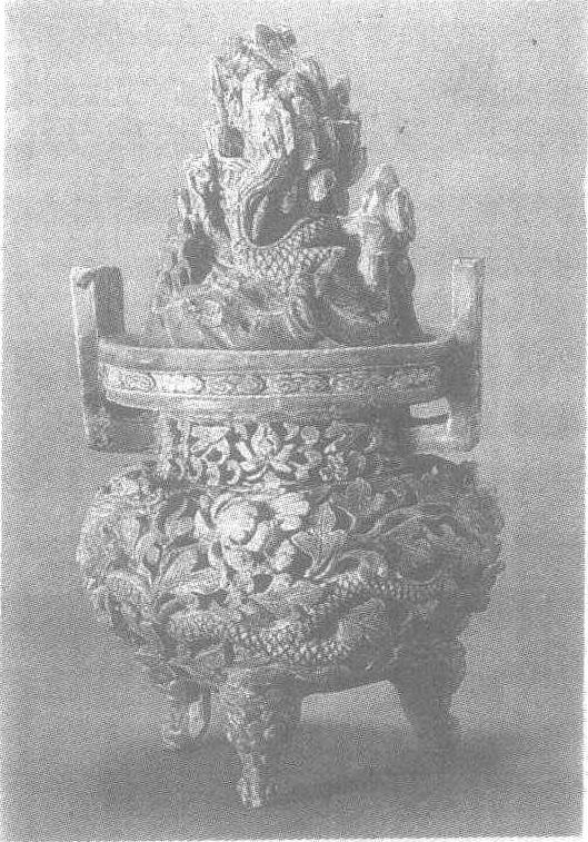 | 释义 | 三彩镂雕龙凤瓷香炉元。通高37厘米,口径22厘米。1964年北京市海淀区出土。北京首都博物馆藏。此炉双直耳,下有蹄形三足,炉盖与炉身有子母口衔接。施黄、蓝、绿三色釉。炉盖为起伏的山峦形,在翠林尽染的山峰中一黄龙引颈攀援。炉身有茂密的花叶,一回首游龙和一昂首展翅凤凰在花叶间环行。全器镂雕细致,刀工熟练。釉色艳丽,华而不俗,颇有气势。