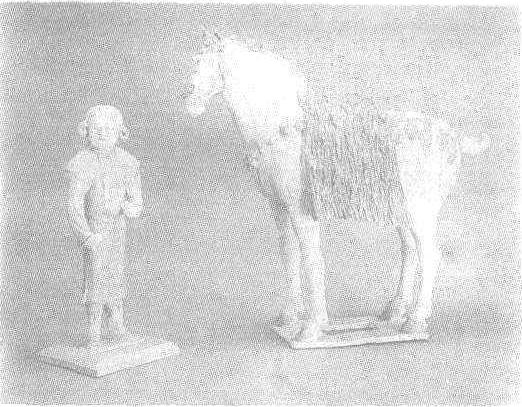 三彩马及牵马俑sancaima ji qianmayong1973年咸阳市战斗公社(今咸阳市渭城区渭阳街道办事处)药王洞村北唐契苾明墓出土。先天元年(712)葬。马高68厘米,俑高49厘米。马头小,臀圆,蹄大,系以西域优良马种为原型塑造而成。马施浅赭色和淡黄色釉,蹄下踏板呈覆槽状。牵马俑头戴尖顶帽,身穿窄袖翻领胡服,衣施赭色釉,翻领为绿色。双手握拳,作牵马状。现藏咸阳博物馆。 |