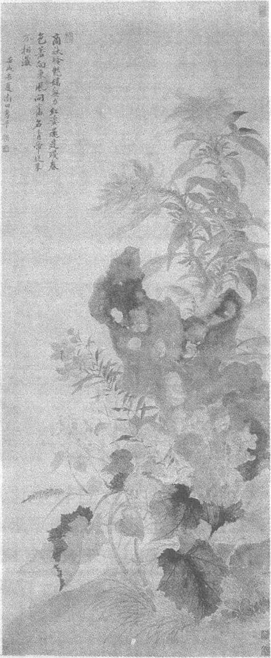 | 释义 | 恽寿平锦石秋花图轴清。恽寿平(见《恽寿平设色花卉册》条目)绘。纸本设色。纵140.5厘米,横58.6厘米。江苏省南京博物院藏。此图画湖石及海棠、雁来红等秋花。湖石玲珑剔透,墨色浅淡。湖石前后的海棠花、雁来红争相吐蕊,竞相斗艳,花朵奇秀,树叶多姿。花卉以没骨叠色渍染法,不用墨笔勾勒,直接画出各异的花卉形态,多姿多彩,自成一格。设色清爽古雅,秀逸滋润;笔法娴熟,极见功力;构图繁而不乱,色调清丽,洒脱飘逸,表现出了浓重的秋意。左上诗曰:“高秋冷艳娇无力,红姿还是残春色。若向东风问旧名,青帝从来不相识。”款署“壬戌长夏南田寿平”,钤〈寿平〉朱文印、〈恽正叔〉白文印。壬戌为康熙二十一年(公元1682年)。此图是恽寿平50岁时用力之作。画上另钤有〈有余闲室宝藏〉、〈虚斋鉴定〉、〈莱臣审藏真迹〉、〈虚斋至精之品〉等收藏章。