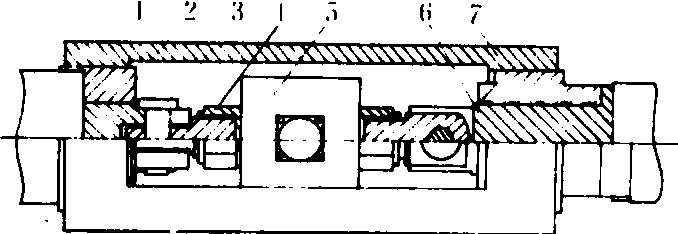 图1 下拉杆与测力传感器的连接 1.承弯套; 2.下拉杆前焊合; 3.销子; 4.拉头; 5.拉力传感器; 6.滑动轴焊合; 7.滑动套 这种测力装置通用性好,只要改变少数连接件就可用于不同类型的拖拉机和悬挂农机具;可以保持原悬挂机构的几何尺寸,不致影响机具的工作状态。但被测农机具的工作阻力,必须在同步测出悬挂杆件瞬时空间位置后,通过运算才能得出。