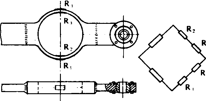 图2 环式测力传感器 悬挂销式 用悬挂测力销置换拖拉机或农机具上原连接销进行测力。 代替拖拉机悬挂装置上三个连接销的悬挂测力销的结构如图3。当测力销电阻应变片的中心线位于通过测力销中心的水平面内时,可以测出测力销所受的纵向水平力。农机具工作阻力的纵向水平分力等于三个销所受的纵向水平力的代数和。为了消除拖拉机提升杆所产生的水平分力对下悬挂销测力的影响,须加设由副拉杆和短杆组成的辅助机构(图4)以保证提升杆始终与地面垂直,不产生水平分力。若改装后拖拉机下拉杆连接点后移A距离,下拉杆也必须相应缩短同样的距离,以保持机组原有的工作状态。