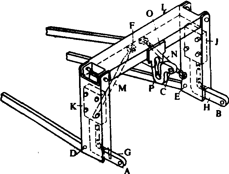图4 悬挂销式测力系统的辅助机构 1.上拉杆; 2.提升杆; 3.副拉杆; 4.短杆; 5.下拉杆;6.原下拉杆连接点 代替农机具悬挂架上连接销的悬挂测力销,具有与农机具悬挂架连接的支臂。通过电阻应变片,可以测出农机具工作阻力的纵向水平分力和垂直分力。悬挂销式测力装置的安装位置准确度与工作时位置变动,对测量精度影响较大。 框架式 用测力框架测定悬挂农机具纵向垂直平面的工作阻力。测力框架的结构如图5。拖拉机三个悬挂杆与框架的D、E、F三个点铰接。农机具悬挂架与框架的A、B、C三个铰接点连接。框架的横梁L与两个长方形空心立柱J和K铰接,并以支持杆M、N来保持其垂直度,支持杆的长度可以调节,便于装拆。G、H弹性元件用螺栓固定在框架的两个立柱上,而弹性元件P与支座O铰接。支座O相对于横梁的位置可以调节,以保证农机具工作时弹性元件P的两端铰接点在同一水平面内,只承受水平力的作用。弹性元件P及G、H的垂直部分各贴一组电阻应变片,组成三个电桥,测量水平力;弹性元件G、H的水平部分各贴一组应变片,组成两个电桥,测量垂直力。