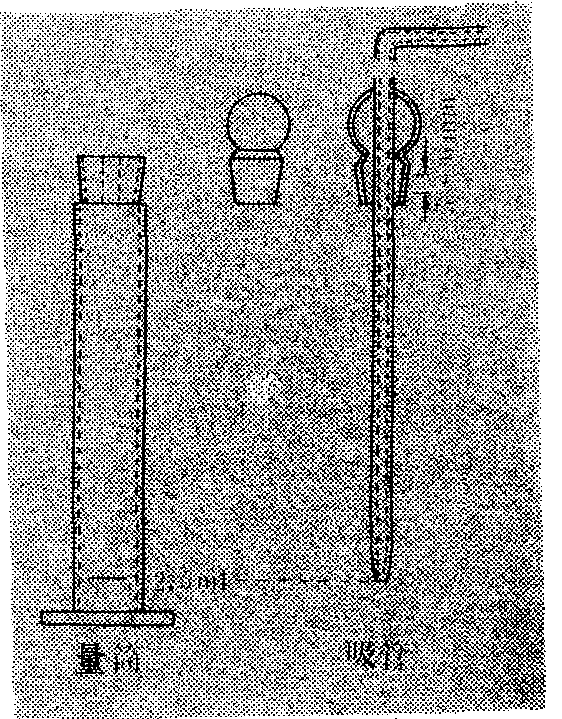 测定方法 国际农药分析协作委员会(CIPAC)颁布的悬浮率测定方法(WHO)及中国亦采用此法是:称取一定量试样,用规定的标准硬水按一定倍数稀释,放入250毫升(中国用200毫升)带塞量筒中,将量筒颠倒30次,在30℃恒温水浴中,静置30分钟后,打开量筒盖,用吸管将筒内上部9/10的悬浮液抽出(见图),用与测定制剂有效成分相同的方法,测出留下的悬浮液及沉淀物中有效成分含量。按下式计算悬浮率: