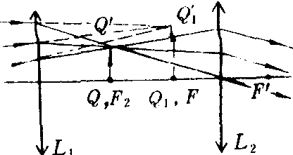 | 释义 | 惠更斯目镜huigengsimujing一种通用的目镜。荷兰物理学家C.惠更斯发明。由同种玻璃(常用冕玻璃)制成的两个平凸透镜L1和L2组成。向场镜L1的凸面向着被观察的物体,接目镜L2的平面接近观察者的眼睛。L1的焦距f′1约为L2的焦距f′2的1.5~3倍,实际上常取2倍。L1和L2之间的距离d等于该二透镜焦距之和的一半,即d=(f′1+f′2)/2,这正是消除横线色差的条件。由计算可知,整个目镜系统的前焦点F在L1和L2之间,后焦点F′在L2之后不远的地方(如图)。由前面物镜所成的实像Q1Q′1位于整个系统的前焦点F处,它对L1来说是一个虚物(对整个目镜而言也是虚物),它经L1所成的QQ′恰在L2的前焦点F2处,于是,通过L2在无穷远处成一放大的虚像,以供眼睛观察。