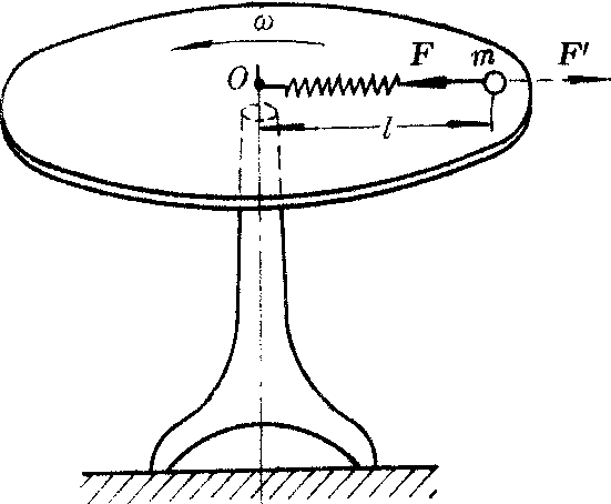 | 释义 | 惯性离心力guanxing lixinli在转动的非惯性参照系中质点受到的一种惯性力。F惯=-mω×(ω×r),式中m为质点的质量,r为质点在动坐标系中的位置矢量,ω为转动坐标系相对于惯性系的角速度。如图在水平放置的光滑转台上,有一轻弹簧其一端通过细绳系在转台中心O,另一端亦通过细绳系一小球。有一个相对转台静止并随转台一起运动的观察者,当转台以角速率ω匀速转动时,他观察到弹簧被拉长,因而弹簧以拉力作用在小球上。在这个观察者看来,小球受力后仍能保持静止不动,为了说明小球为什么能保持平衡,他必须想象有一个与弹簧拉力方向相反、大小相等的力作用在小球上,这个力就叫惯性离心力。对另一个站在地面(惯性参照系)上的观察者来说,作匀速圆周运动的小球本身只受到向心力的作用,并不受到什么惯性离心力。显然,引入惯性离心力是为了从非惯性系来看力学现象时,使质点相对于非惯性系的运动在形式上仍满足牛顿第二定律,这是在非惯性系中所采用的处理力学问题的一种方法。惯性离心力不是由物体间相互作用产生的,所以不能指出什么物体引起了惯性离心力,也不可能找到它的反作用力。地球是一个相对于惯性系有转动的非惯性系,所以静止在地面上的物体除位于地球两极外,都受到惯性离心力的作用,物体所受到的重力就是地球施于的引力和该物体的惯性离心力之矢量和。