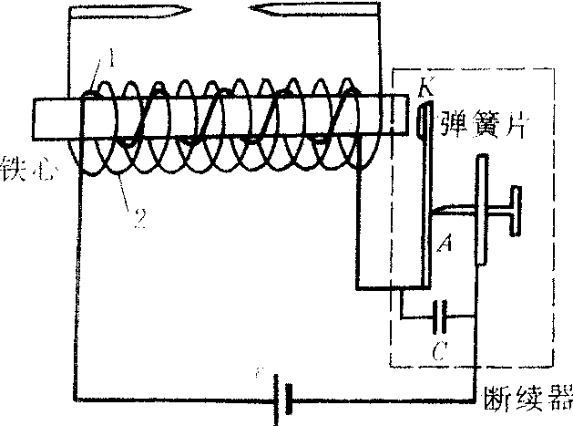 原线圈1用粗导线绕制,匝数少,它通过弹簧片经螺钉A与直流电源相联。副线圈2用匝数很多的绝缘细导线与1绕在同一铁心上,线圈两端分别与金属针(或球)相联,形成开路。当线圈1与电源接通时,由于铁心磁化而吸引弹簧片K,结果使K与A分开,造成电路断开;而当电路一旦断开后,铁心不再吸引K,弹簧片由于弹性将弹回原处与A再次接触,于是电源再次接通。如此循环往复,使线圈1中通过断续的电流。正是由于在电路接通和断开时的电流变化,使得副线圈中感应出很高的电动势。断续器中的电容C是为了削弱触头处的火花而设的,分析电路时可不考虑。 |
