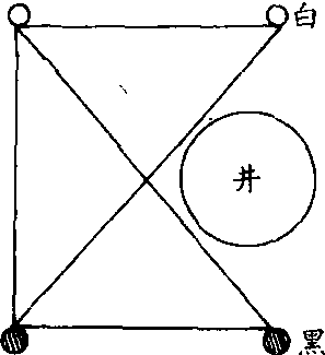 又名跳井。民间流行的娱乐形式。耕作之余,村民席地而坐,拾几根小棒或土块,画上图案便开始游戏。玩法:两人一局,每人两枚子,走时纵横斜直不限,一次走一步。如图,第一步不允许憋死对方,只能先走左边的一块,对方则移至空下的位置,依次见空则走。看似简单,但要快走,稍不谨慎就被对方憋死,只好跳井。