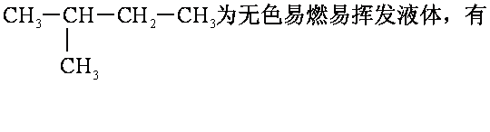 (正) 戊烷CH3CH2CH2CH2CH3,无色易燃易挥发液体,有微弱的薄荷香味; 熔点为-130℃,沸点为36.1℃; 相对密度为0.626; 不溶于水,溶于烃类和醚等; 临界温度为 196.4℃,临界压力为3.35 MPa; 其蒸气能与空气形成爆炸性混合物,爆炸极限为1.5%~7.8%。正戊烷主要用做溶剂,制造人造冰、麻醉剂、合成戊醇。正戊烷在氯化铝和氯化氢存在下异构化成异戊烷。2-甲基丁烷 (异戊烷)