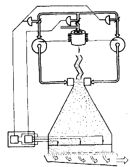 正弦波形气流成型 是当前干法纤维板生产较为新颖的成型方法。其设备如图。纤维通过Z字型下料管,两侧有气流交替吹风,使纤维成正弦曲线状态下落。该机附设有横向三点厚度检测仪和电子计量秤以及完善的控制装置,用来检测控制成型板坯的质量。